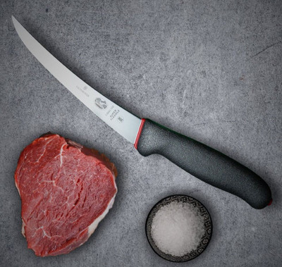 Victorinox Dual Grip -lihaveitsi on ammattikäyttöön suunniteltu veitsi, joka soveltuu monipuolisesti erilaisten lihojen käsittelyyn. Erittäin joustava, kapea ja kaareva terä mahdollistaa vaivattoman ja hallitun leikkaamisen. Terän pituus 15cm. Ergonominen ja erityiskarhennettu kaksikomponenttikumikahva takaa tukevan otteen ja vähentää käteen kohdistuvaa kuormitusta pitkäaikaisessakin työssä, sillä kahvaa ei tarvitse puristaa luistamisen välttämiseksi. Veitsi kestää steriloinnin 100 °C:een asti ja on NSF-sertifioitu. Valmistettu Sveitsissä. Kahvan materiaali: TPE ja PP-muovi.