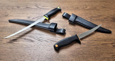 Kershaw filettien terät valmistetaan laadukkaasta 420J2 ruostumattomasta hiiliteräksestä. Terien kovuus on HRC 55, veitset pysyvät hyvin terässä ja kestävät kovaakin käyttöä. Sormisuojalla varustettu kahva valmistettu kumimuoviseoksesta, joka takaa aina pitävän otteen.